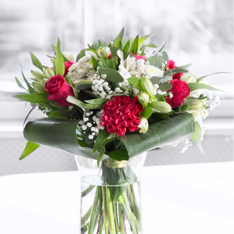 Embrace the heavenly harmony of our Heavenly Harmony Bouquet. This beautiful arrangement features sweet white chrysanthemums and gypsophila paired with luxurious red roses and carnations, elegantly combined with white alstroemeria and aspidistra leaves.